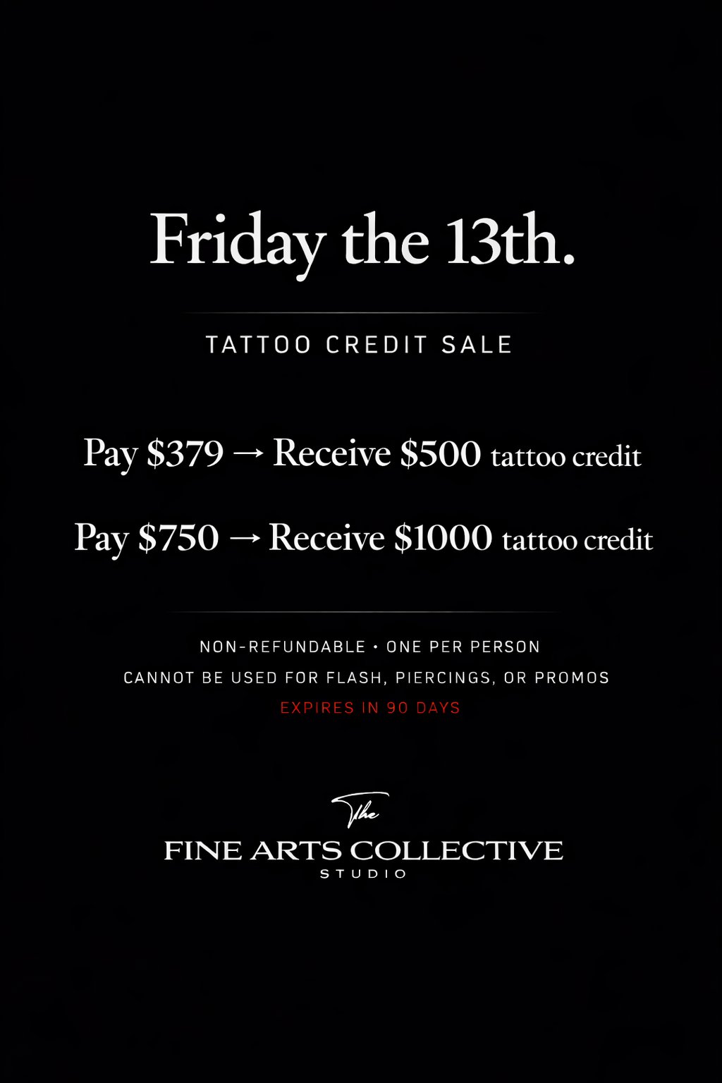 Your credit may be applied toward any custom tattoo appointment at The Fine Arts Collective Studio.